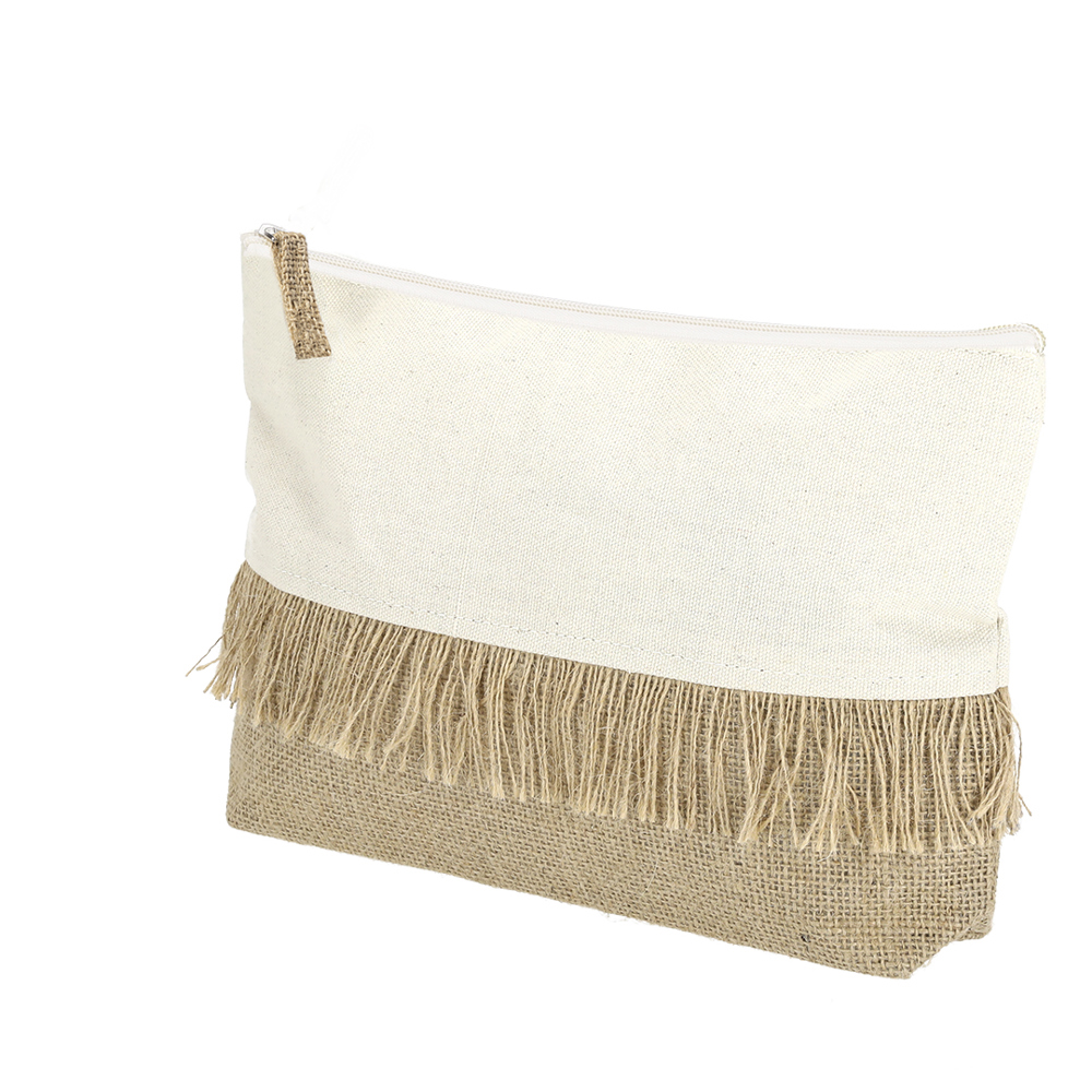 Etui in een combinatie van gelamineerd jute en natuurlijk katoen. Met opvallende franjes, rits in natuurlijke kleur en jute trekkoord.
