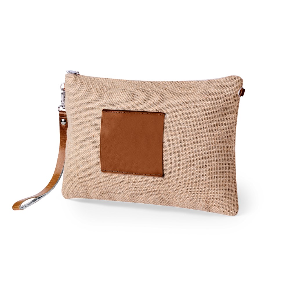 Multifunctionele beautytas in een combinatie van gelamineerd jute en PU-leer. Met ritssluiting, metalen handvat en bijpassend centraal frame in naturelkleurig PU-leer. Gepresenteerd in een individueel tasje.