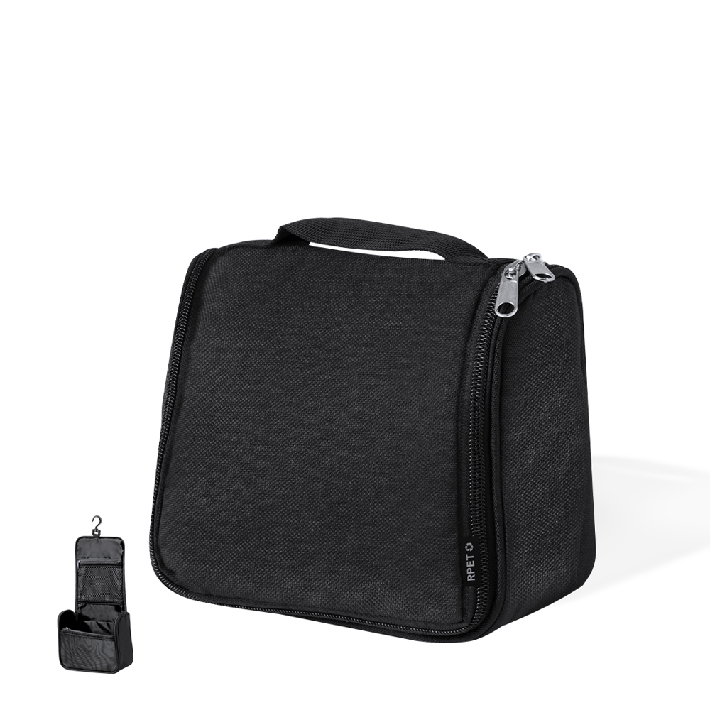 Schoonheidstasje van RPET, om persoonlijke hygiëneproducten in op te bergen, met praktisch haakje om het overal vast te houden. Handige binnenkant met ademende gaasvakken om de spullen erin te kunnen zien. Met RPET-logo op label en verkrijgbaar in verschillende kleuren. Gepresenteerd in een individueel gerecycled zakje.RPET-materiaal is gemaakt van gerecycled plastic, wat het hergebruik van plastic afval bevordert en bijdraagt aan de duurzaamheid van de planeet.